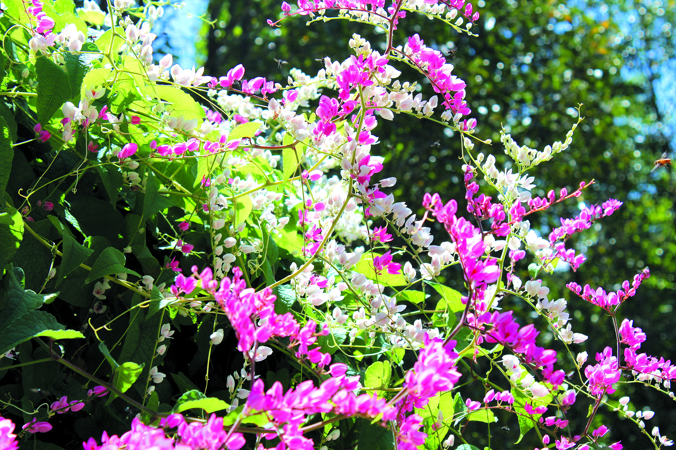 Pokok air mata pengantin (Antigonon Leptopus) ditanam khas di dalam kebun sebagai sumber debunga untuk lebah kelulut ketika di luar musim bunga durian.