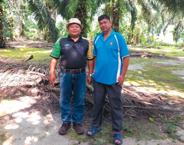 Pegawai MPOB Bagan Datuk, Encik Mazli (kiri), mengadakan lawatan ke kebun Encik Beh untuk menyaksikan hasil tuaian yang mengagumkan dan mendengar pengalamannya dalam pengurusan pembajaan.