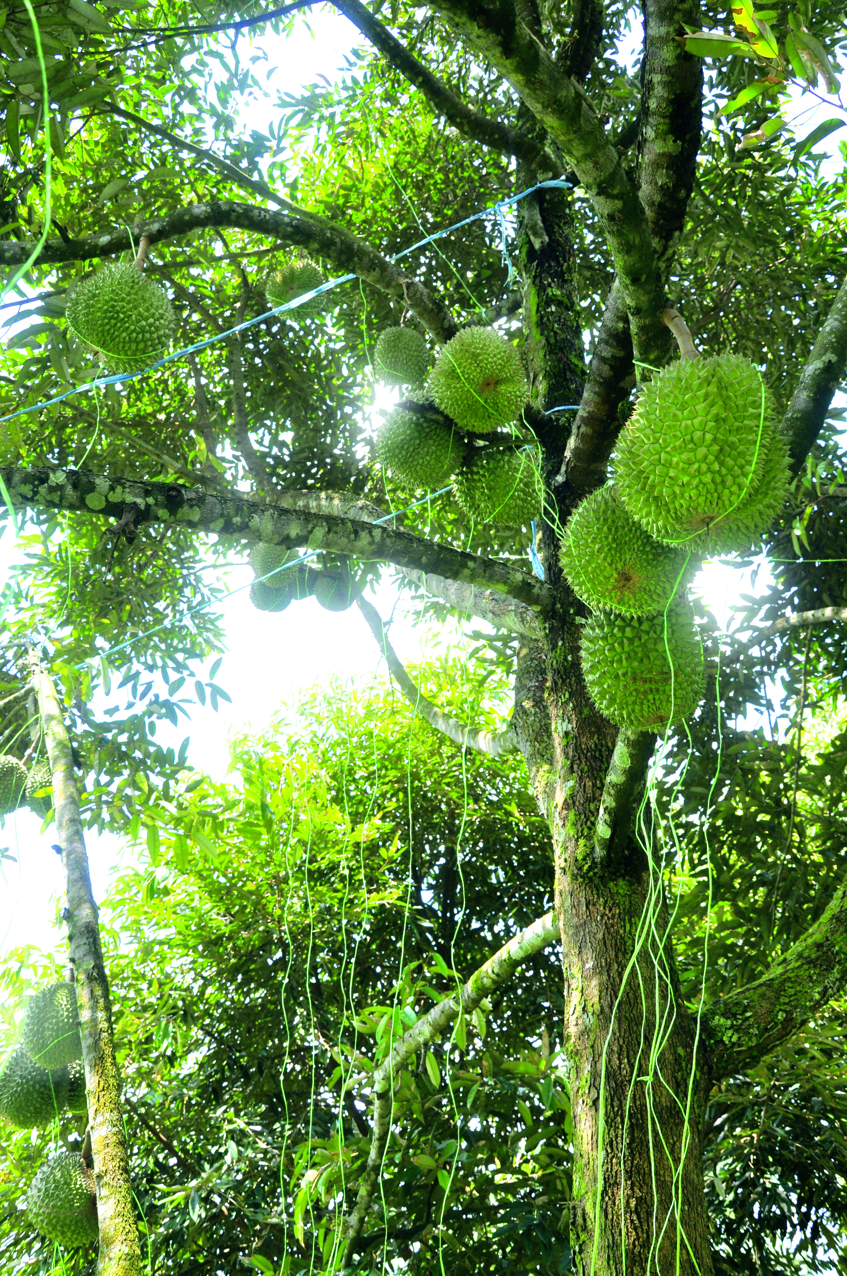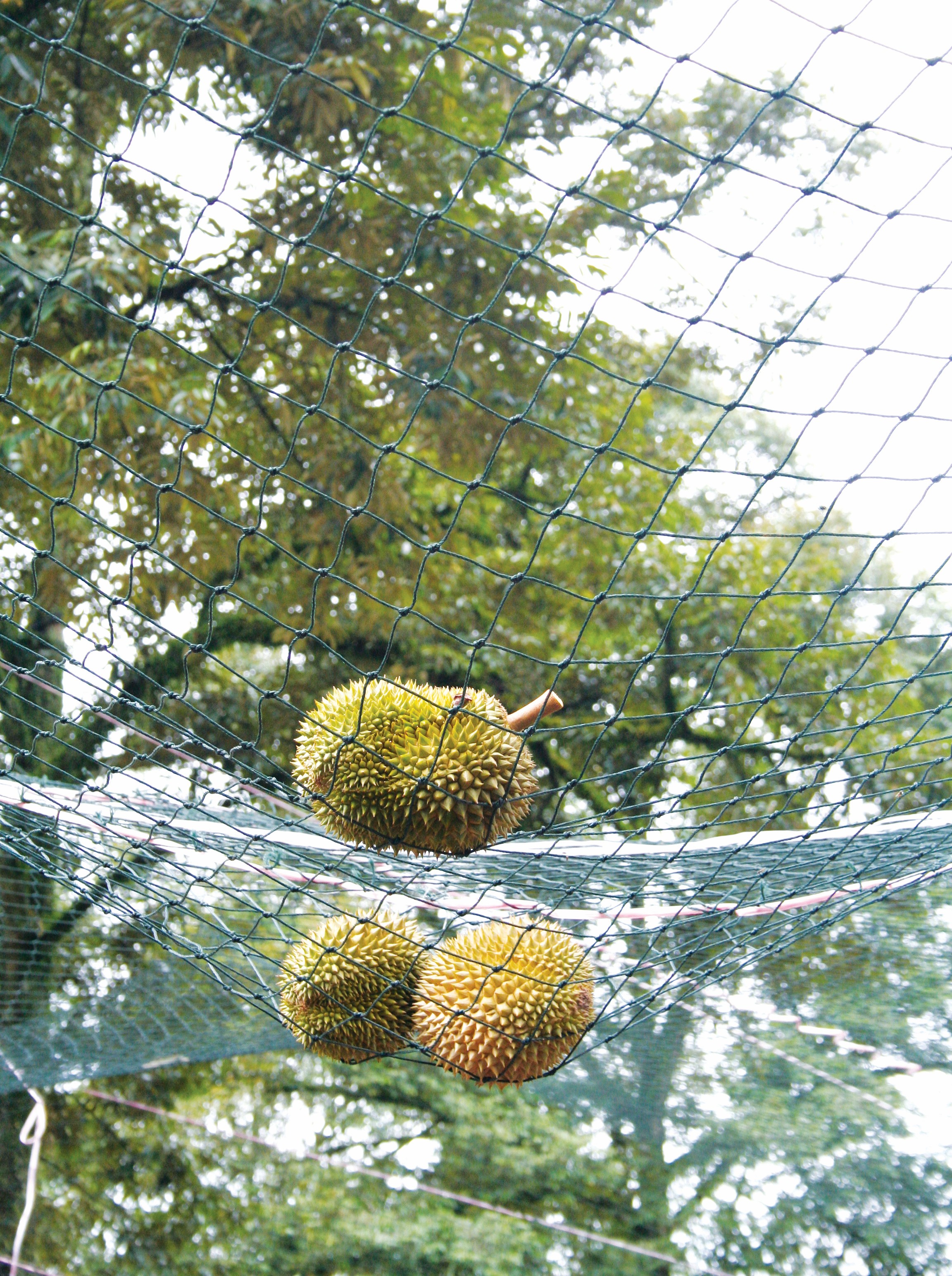 Pengeluaran kecil durian memungkinkan setiap buah dapat dipantau, dibungkus atau dipasang geruk dawai bagi mengelakkan daripada ditebuk tupai, yang tidak mungkin dapat dilakukan oleh estet besar.