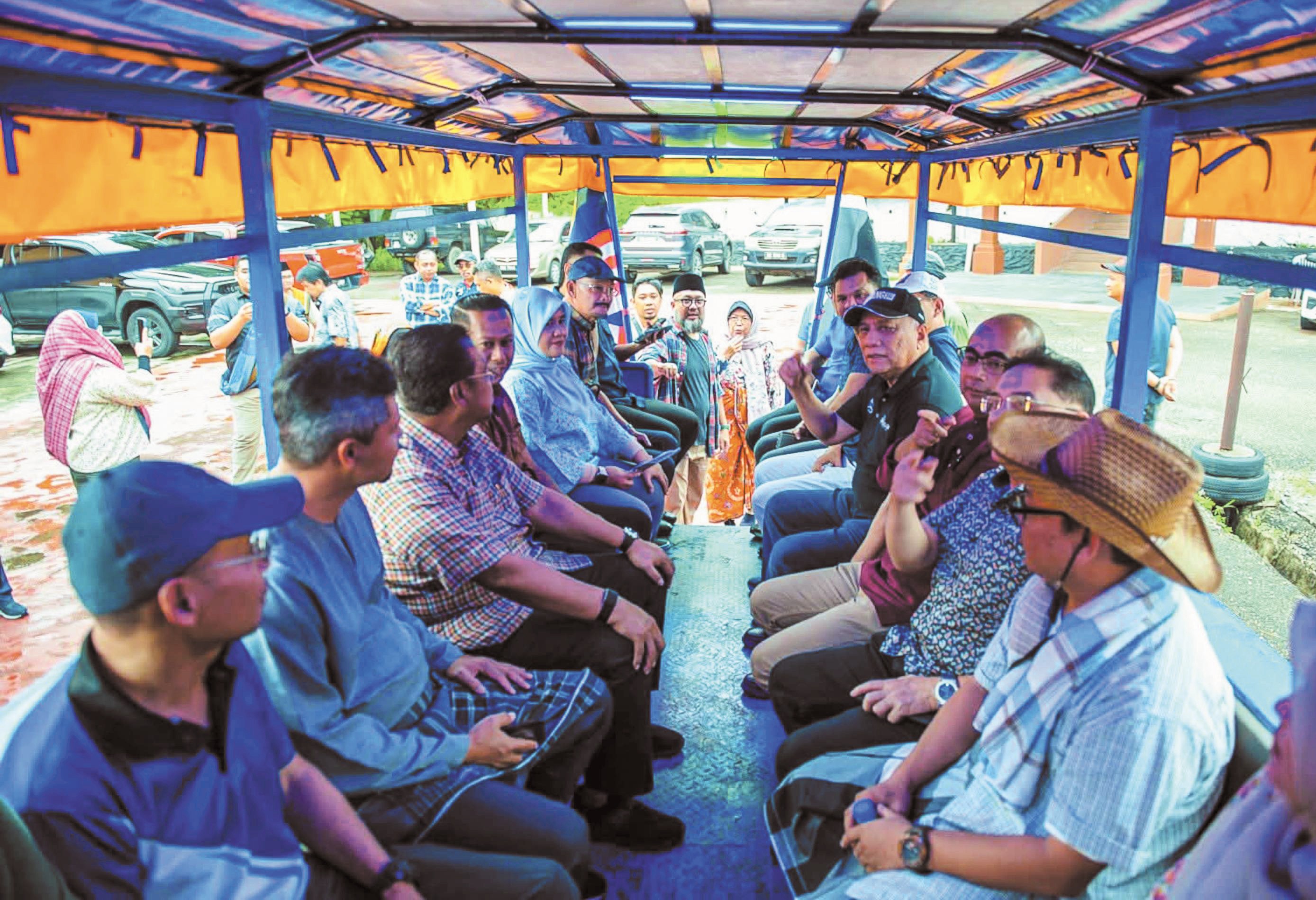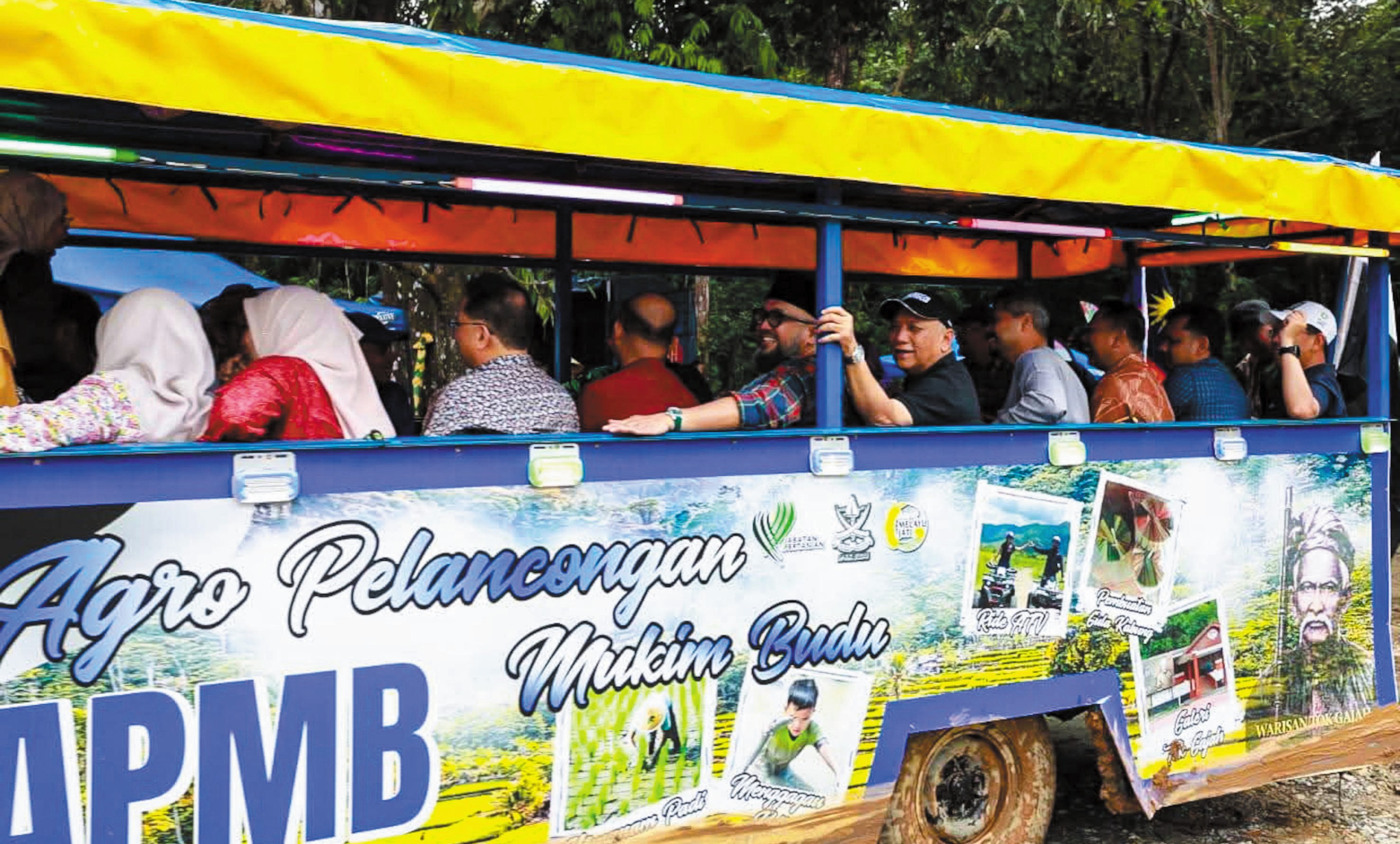 Pengunjung dibawa menaiki tram khas bagi melihat perkembangan projek Padi Kampung Budu di kawasan Paya Tengah, dalam daerah Lipis, Pahang.