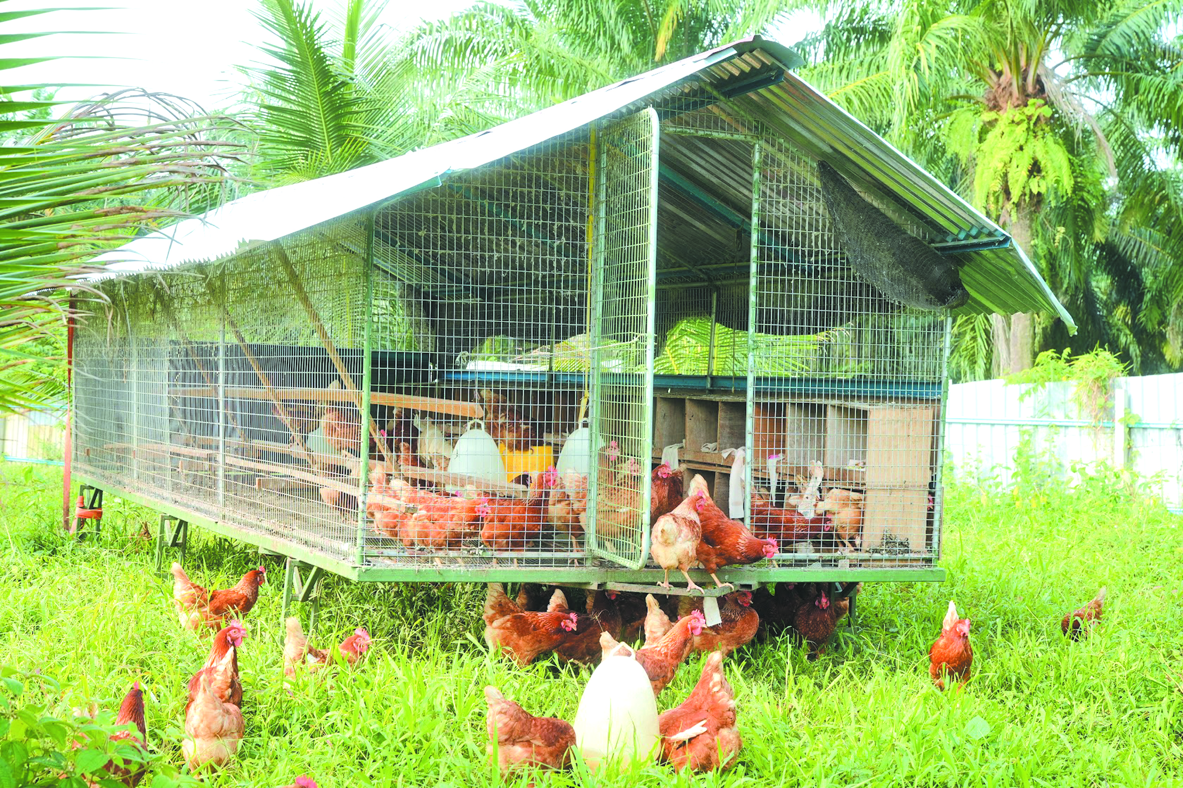 Najis ayam menjadi baja semula jadi, lantas mengurangkan perbelanjaan untuk baja kimia. Rumput dan tanaman penutup pula menjadi sebahagian daripada makanan ternakan, seterusnya mengurangkan kebergantungan terhadap makanan import.