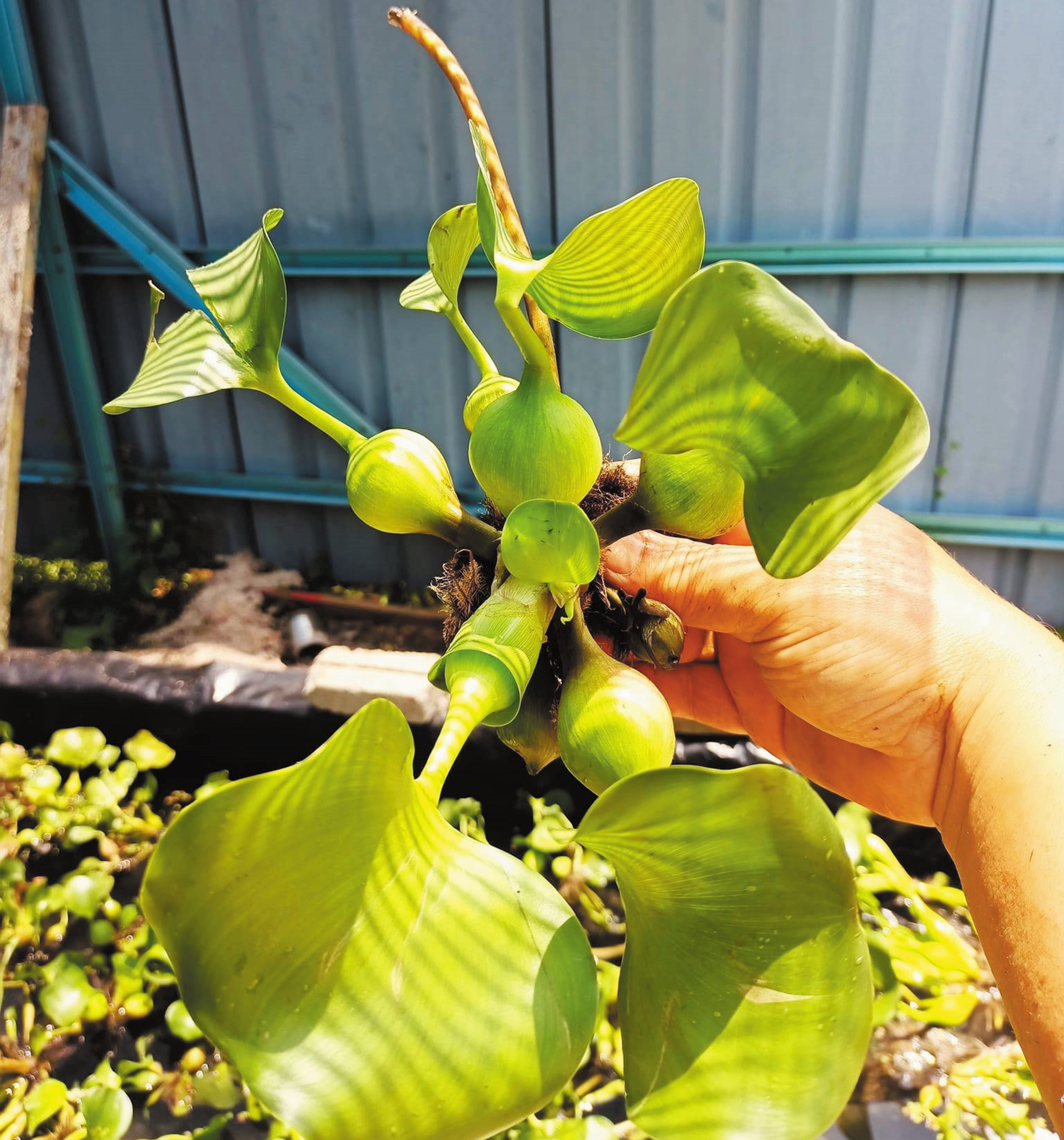 Keladi Bunting (Water Hyacinth) boleh dituai di tasik dan longkang yang tercemar. Selain boleh diproses menjadi makanan ternakan dengan teknik fermentasi, tuaian berkalanya dapat menjaga permukaan tasik dan longkang daripada tersumbat. Keladi bunting sangat sesuai untuk ternakan itik Nila/Muscovy yang tinjanya dimanfaatkan untuk makanan ikan pemakan tumbuhan seperti kap, kelah, dan lampam jawa. Hanya bina reban di atas kolam, kerja memberi makan ikan berjalan secara automatik.