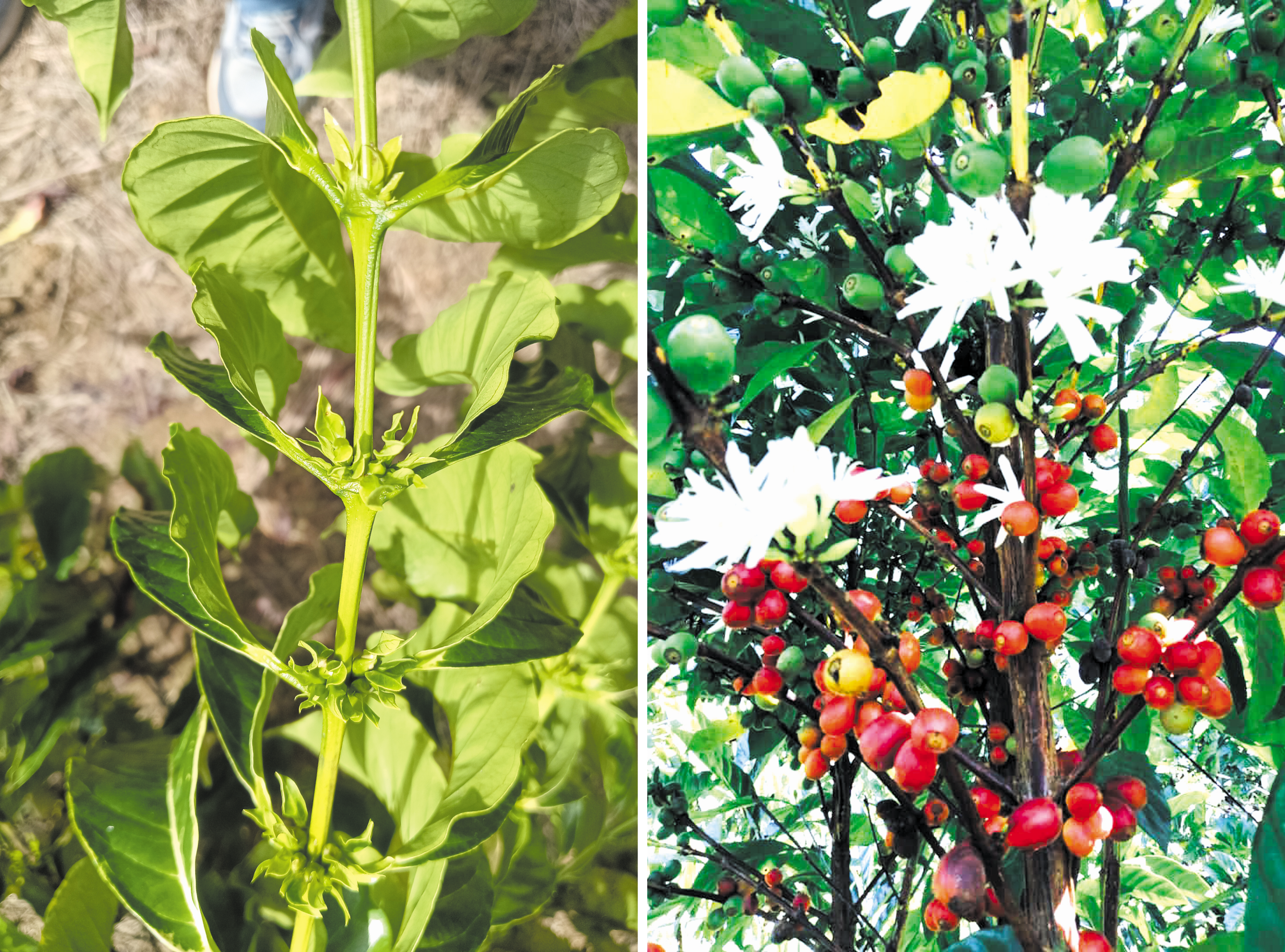 Haji Zakaria Hassan, 65 - Pengasas Kebun Kopi Sik, Ranting Robusta mula berbunga, Liberika sedang masak dan berbunga lagi.