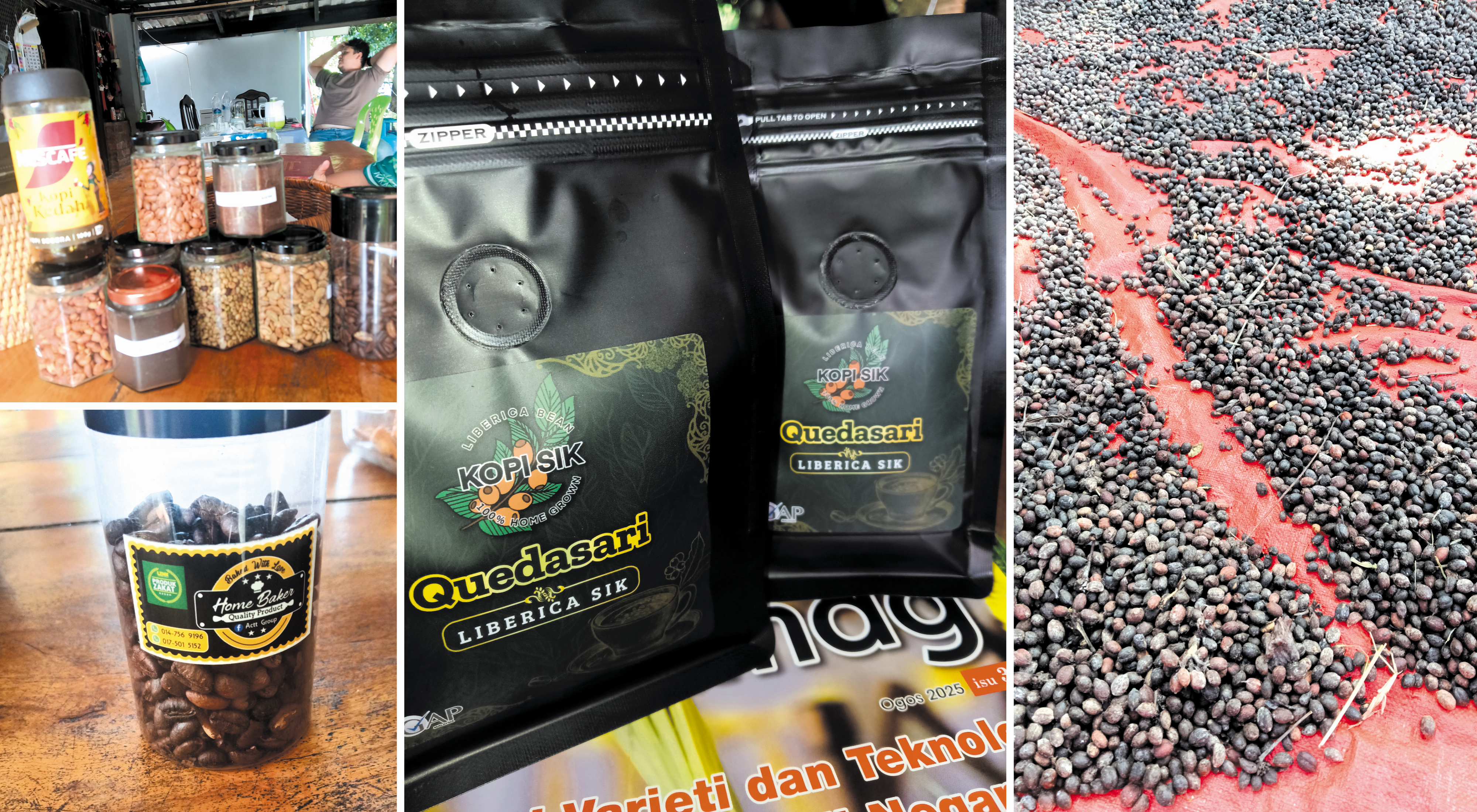 Sample biji-biji kopi, produk siap Liberika Sik dan buah Robusta sedang dijemur.