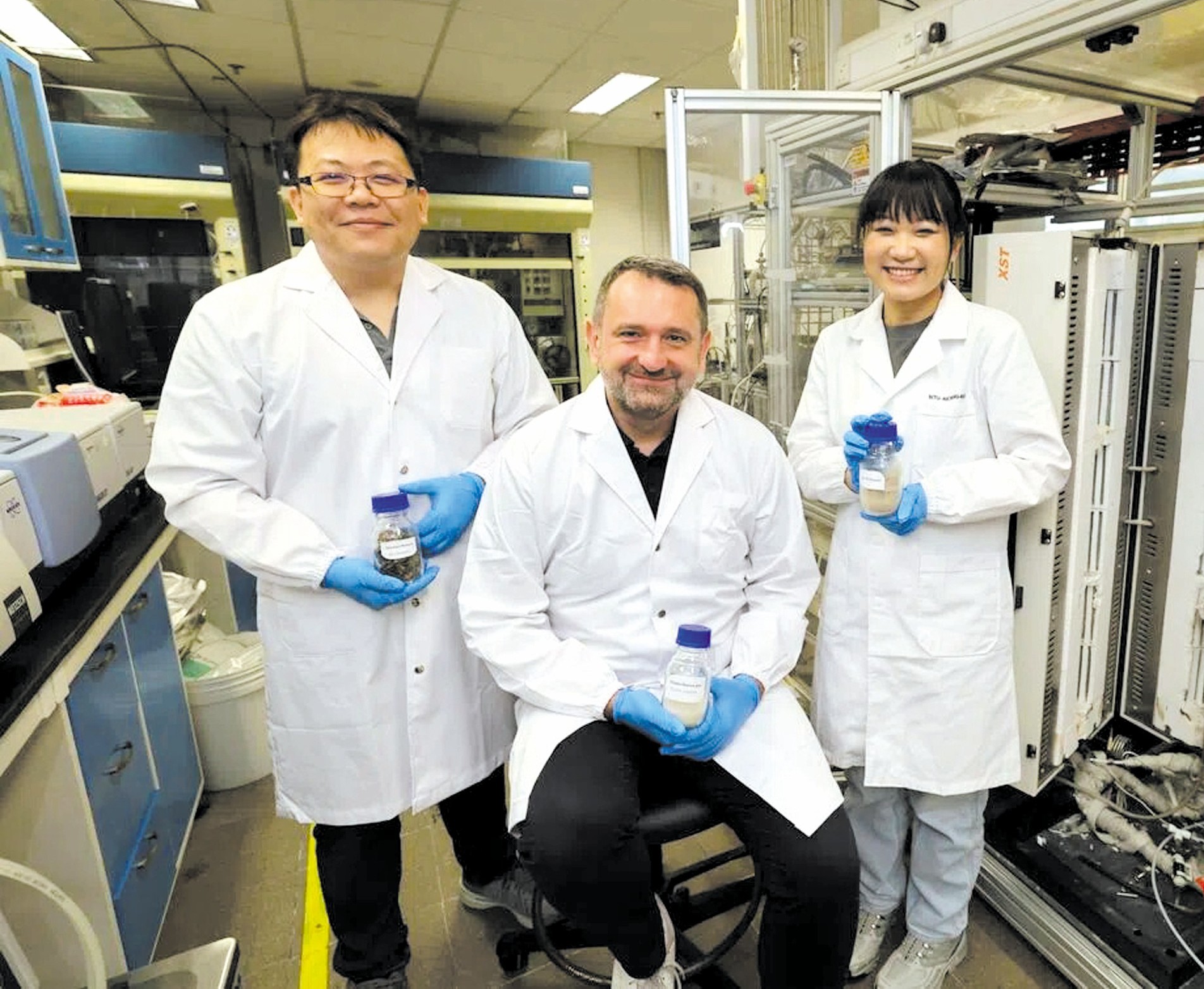 Penolong Profesor Lee Shuitak, Timbalan Pengarah Penyelidikan Alam Sekitar dan Sumber Air di NTU (tengah), bersama Penyelidik Kanan Chen Weibin (kiri) dan pelajar PhD Bu Jia Hui mendapati bahawa najis ayam yang diproses dapat menangkap karbon dioksida melalui proses kitaran kalsium. (Kredit: zaobao.sg)