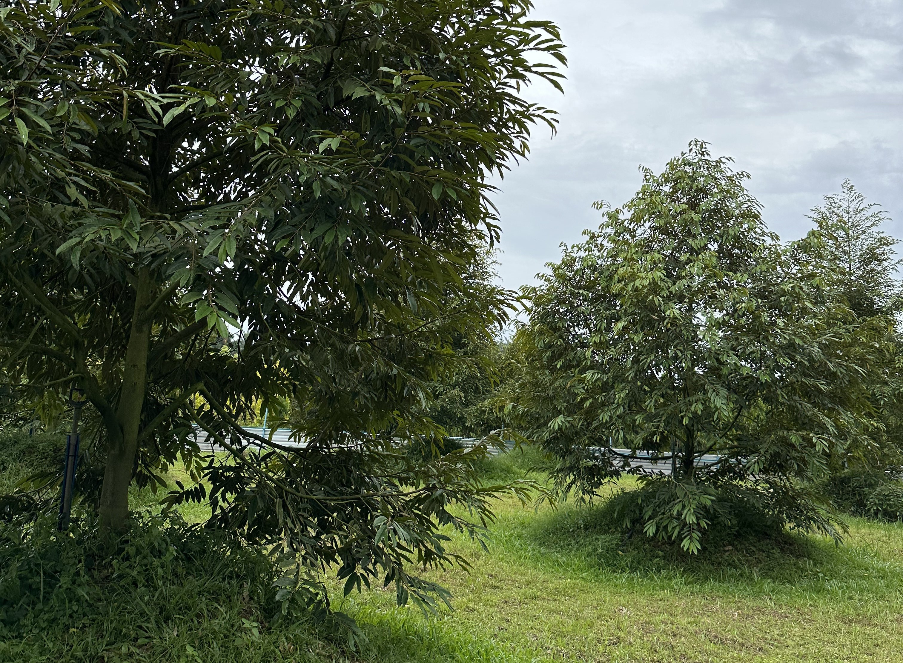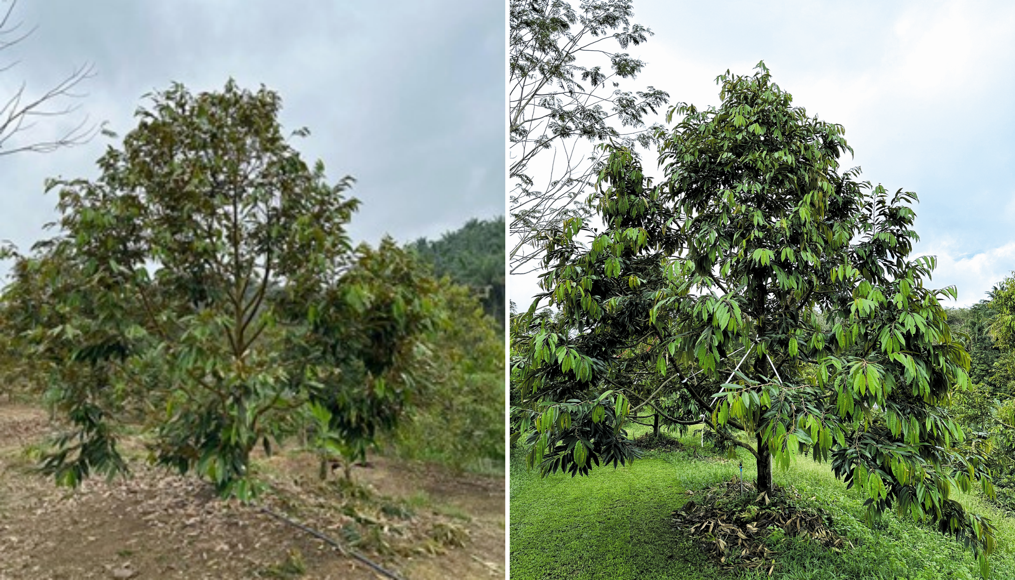 Antara rujukan pengurusan covercrop di dalam pengurusan tanaman durian yang dilakukan di ladang ini. Gambar kiri (pengurusan secara kimia) dan gambar kanan keadaan pokok selepas 4-5 bulan melalui penyimpanan covercrop. Pemerhatian ini dijalankan di ladang milik beliau bersama pihak Jabatan Pertanian Daerah Raub.