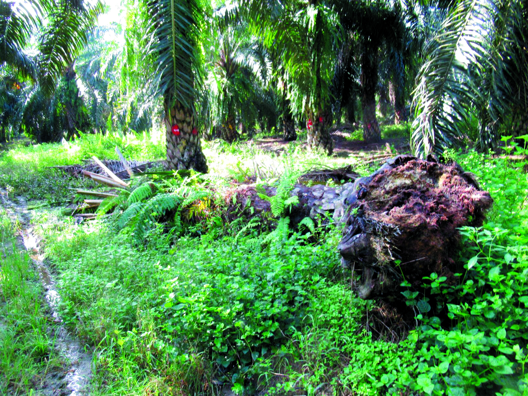 Pokok kelapa sawit matang tumbang akibat jangkitan teruk kulat Ganoderma, menyebabkan kecekapan pengeluaran dan keupayaan memperoleh kawasan kebun menurun.